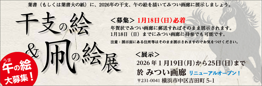葉書(もしくは葉書大の紙)に2026年の干支「午(うま・馬)」の絵を描いてみつい画廊にお送りください!